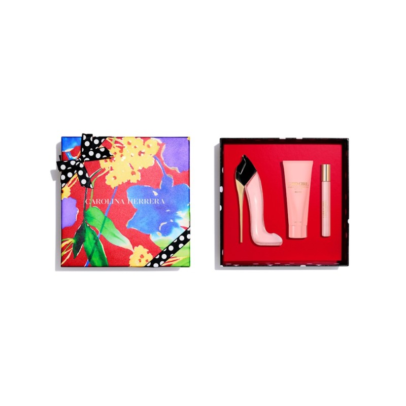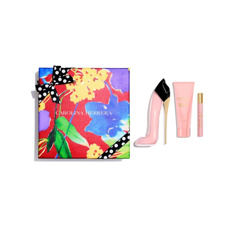 Good Girl Blush Eau de Parfum es una fresca y floral explosión de feminidad alojada en un delicado zapato de tacón rosa pastel. Este set de regalo de tres artículos contiene Good Girl Blush Eau de Parfum (80ml), Megavaporizador (10ml) y Loción Corporal (100ml), una crema suntuosa que nutre la piel y la deja suave y con un seductor perfume.