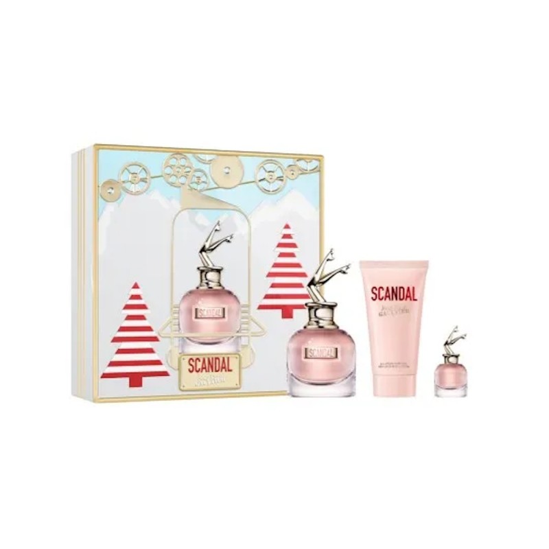Un kit de alta montaña para una feminidad que rompe el hielo. En el centro, el frasco icónico de Scandal, de 50ml, con sus piernas al aire desafía las temperaturas bajo cero. Le acompañan la loción corporal perfumada, de 75ml, que envuelve la piel en una caricia reconfortante, y una miniatura de viaje, de 6ml, para que tu estela escandalosa te siga hasta en la cumbre más alta. Es el regalo perfecto para quienes viven las fiestas como una aventura llena de lujo y diversión.