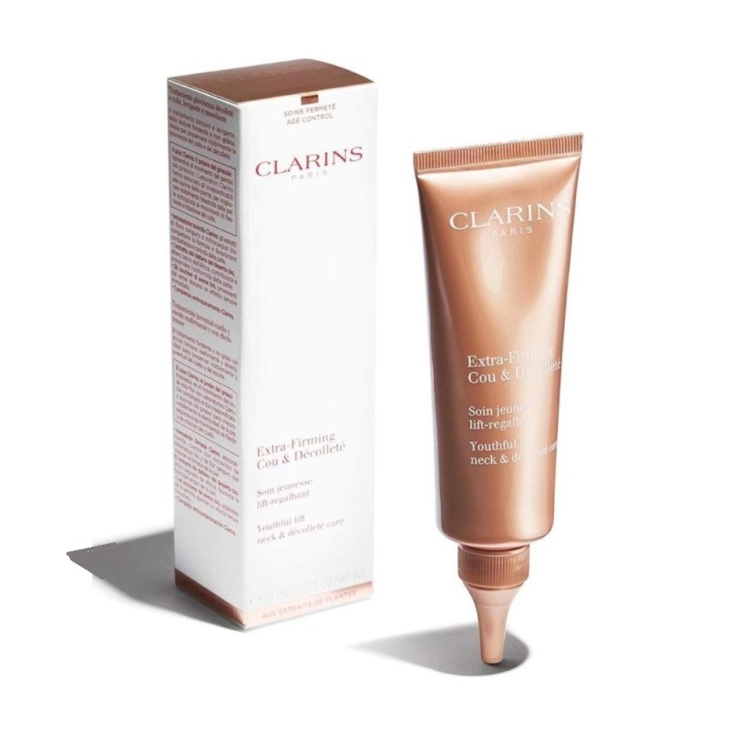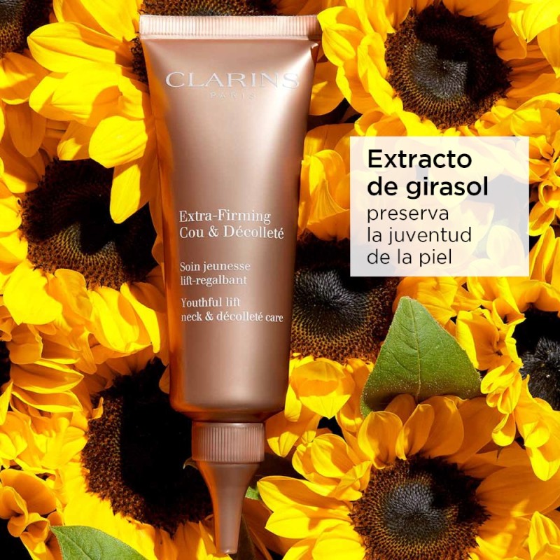 El cuello y el escote son zonas frágiles y a menudo olvidadas en los rituales de tratamientos diarios. La edad y el impacto de los movimientos cotidianos a que está sometida hacen que la piel se arrugue y se pliegue con mucha más facilidad. Extra-Firming Crema juventud del cuello y escote es el tratamiento reafirmante, con efecto tensor y alisador deliciosamente fundente y no graso, ideal para preservar visiblemente la juventud del cuello y el escote. Día tras día, esta zona móvil tan frágil y delicada recupera su encanto, firmeza y sujeción.