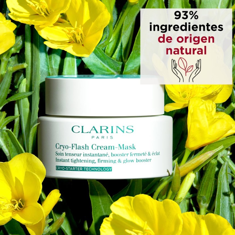 INNOVACIÓN CRYO-STARTER TECHNOLOGY: los Laboratorios Clarins han desarrollado una doble tecnología molecular y vegetal capaz de reproducir los mecanismos del frío en la piel: molécula M.G.A, derivado de mentol y extracto de onagra, una planta bio exclusiva de Clarins.