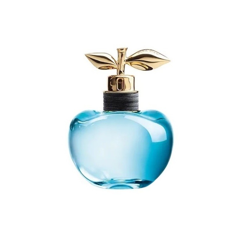 El icónico frasco con forma de manzana de Nina se transforma en una joya nocturna con un tono azul eléctrico y profundo. Está adornado con un cuello de cuero negro y un precioso tapón de hojas doradas, simbolizando la dualidad entre la luz y la sombra.
