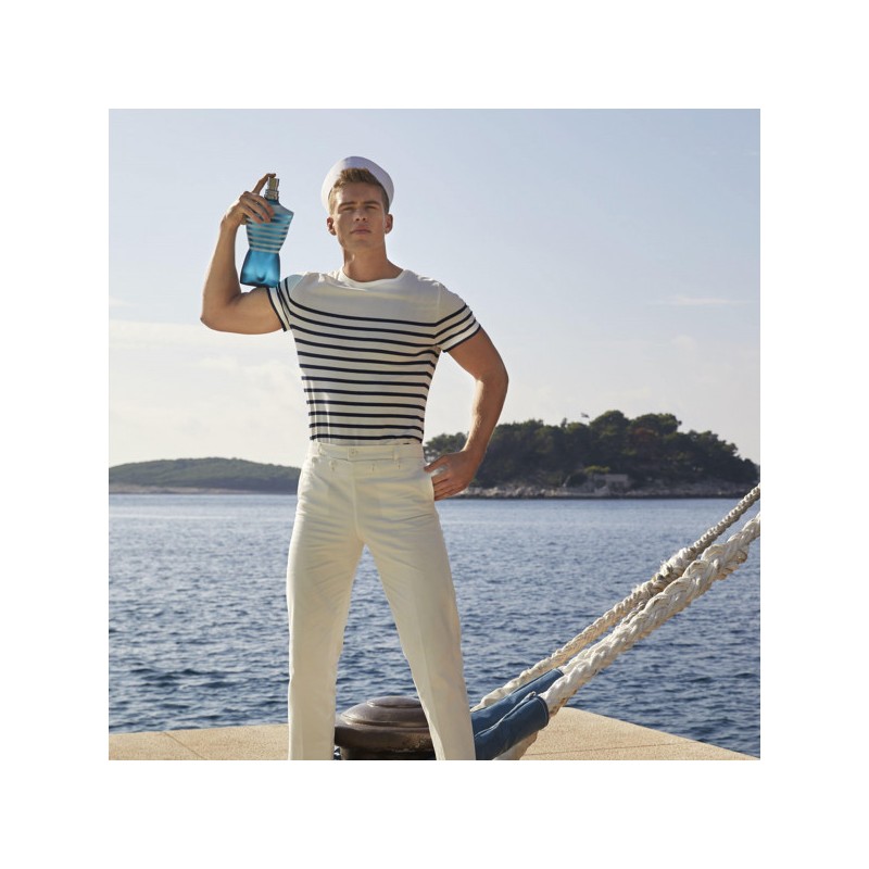 Un frasco-torso con atributos decididamente masculinos. En el vidrio transparente se dibuja la pieza emblemática del vestuario masculino de Jean Paul Gaultier: la marinera, símbolo de libertad y seducción.