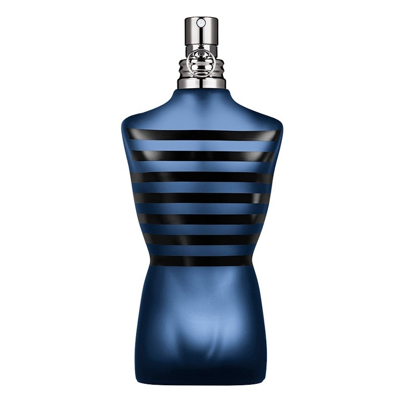 Ultra Male retoma la forma del frasco busto de Lea Male asumiendo sus atributos masculinos. Se tiñe de azul noche con una marinera negra para revelar más intensidad.