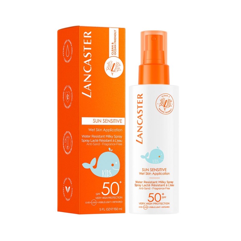 Protector Solar Niños. ¡Esta nueva protección solar de Lancaster, óptima para niños, es el mejor aliado de una madre! Debido a que los niños necesitan una protección muy alta, nuestro Milky Spray For Kids SPF50+ combina la Full Light Technology de Lancaster y nuestro Complejo Sunsicalm de origen natural para asegurar nuestra protección más amplia para la piel sensible de los niños.